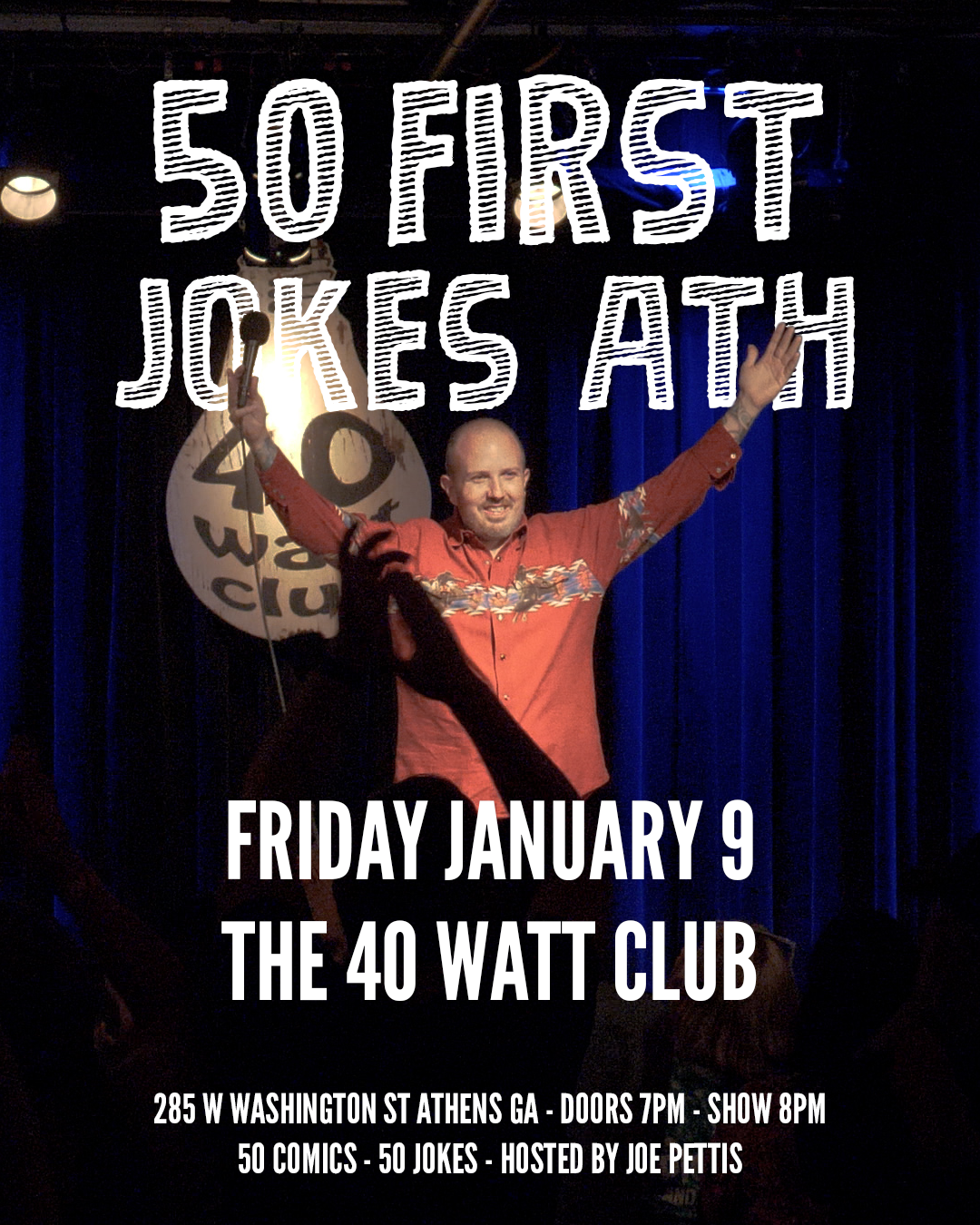50 FIRST JOKES ATHENS features 50 of Georgia’s best comics sharing their first new joke of the year. Each comic gets two minutes to share a joke previously untold.